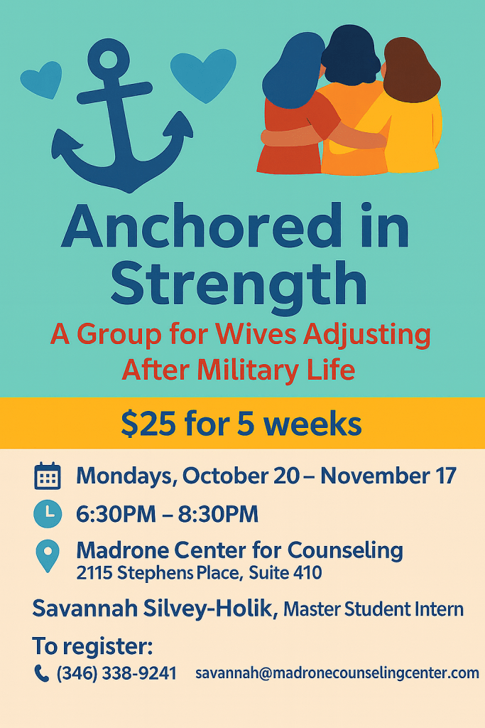 Upcoming Group Sessions to support Wives Adjusting After the Military starting Oct 20 – Nov 17th! A Share this: Click to share on X (Opens in new window) X Click to share on Facebook (Opens in new window) Facebook Like Loading...